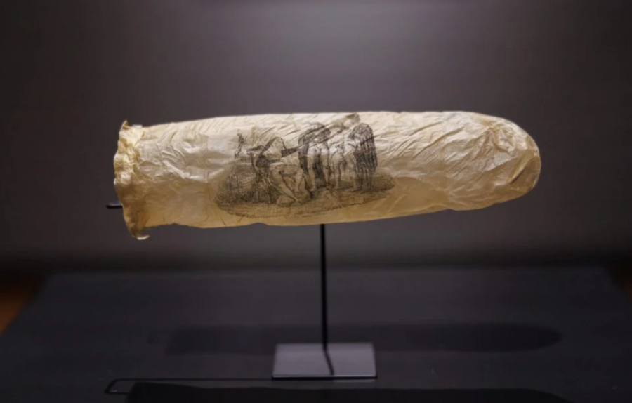 A 19th century condom printed with a sexual scene involving a nun and three members of the clergy, is on display in the exhibition “Safe Sex?” at the national museum. In the bawdy scene, the nun has raised her skirt to reveal her crotch as three clergymen expose themselves to her, over the caption Voilà, mon choix (there, that’s my choice). The scene echoes, with genders reversed, the classical scene of the Judgment of Paris, in which the Trojan prince is forced to decide who was most beautiful among the goddesses Aphrodite, Hera, and Athena.
