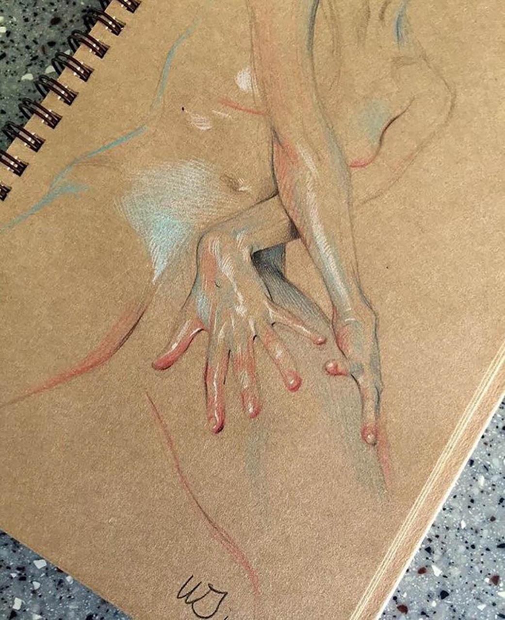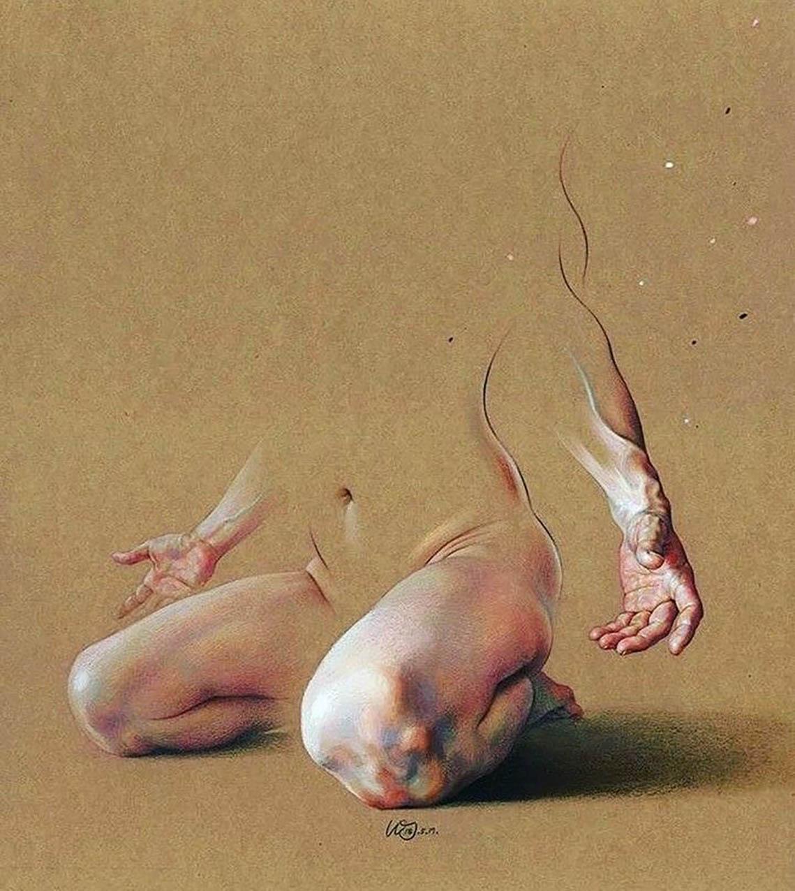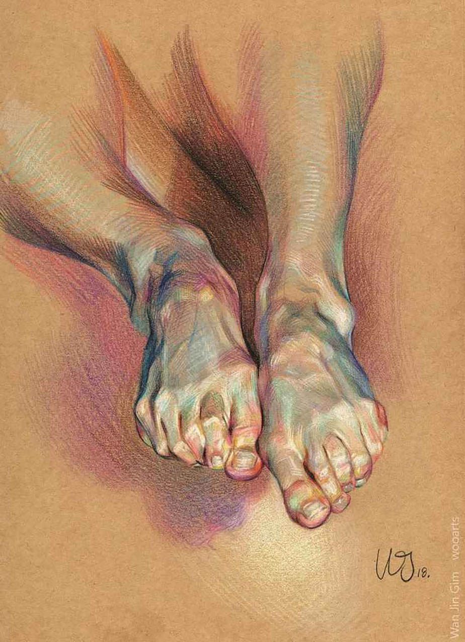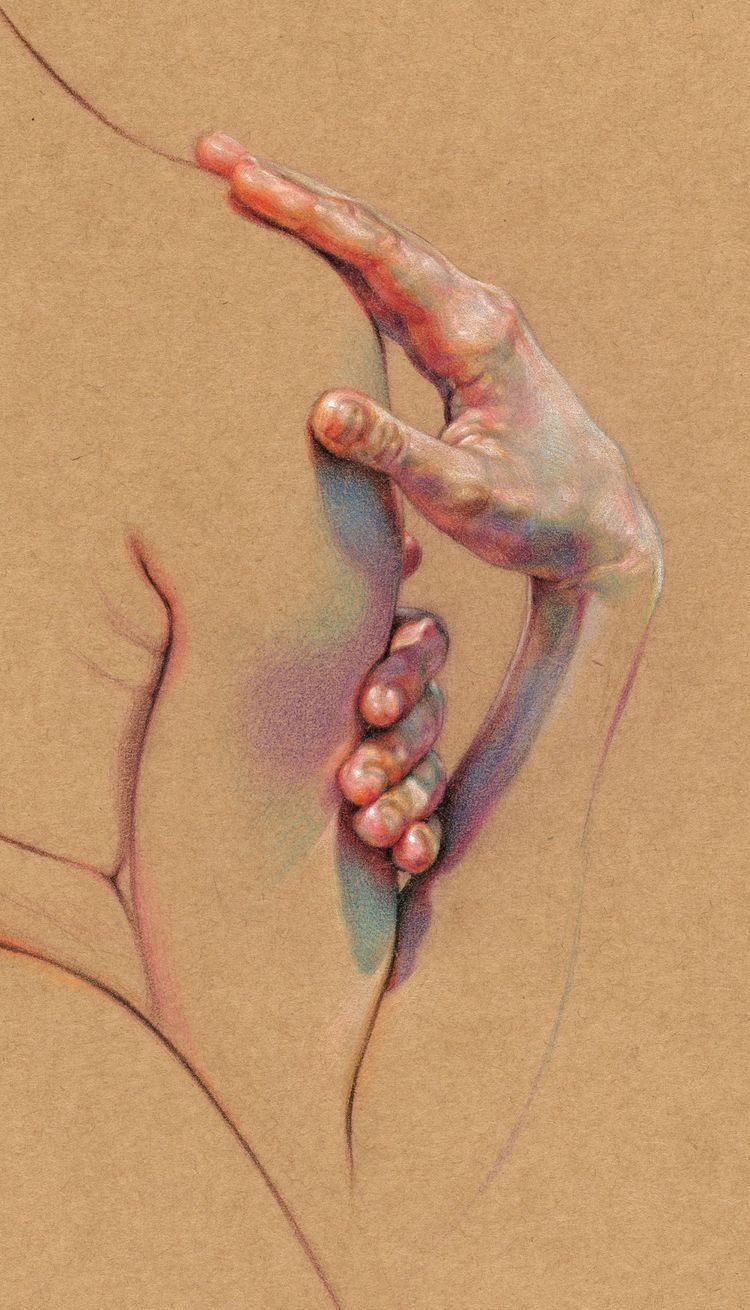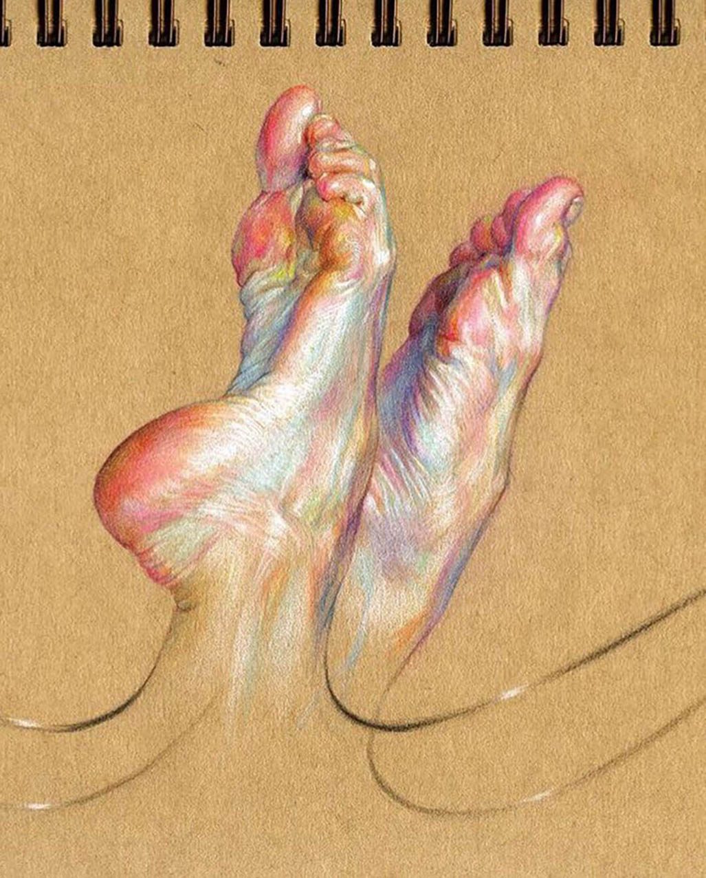 Fascinated by the paintings of Lucian Freud, Wanjin incredible creates sensual hyperrealistic paintings and drawings of the human anatomy, particularly hands and feet. He usually paints nudes that allow him to express the abstract curves of the human body and the infinite tones of the surface of the skin so you can almost feel its texture. His artworks carry a delicate realism full of details in which you can even distinguish veins, hairs and muscles. Working with coloured pencils acrylic paint and inks he creates complex hatched layers of colour, and adding paint or ink to soften the image giving it an ethereal look.