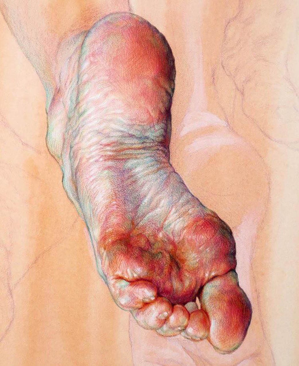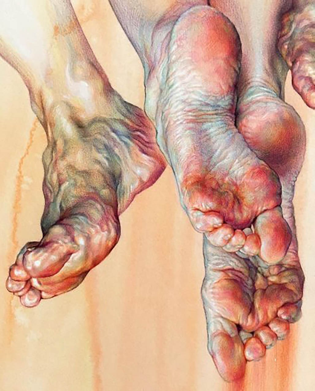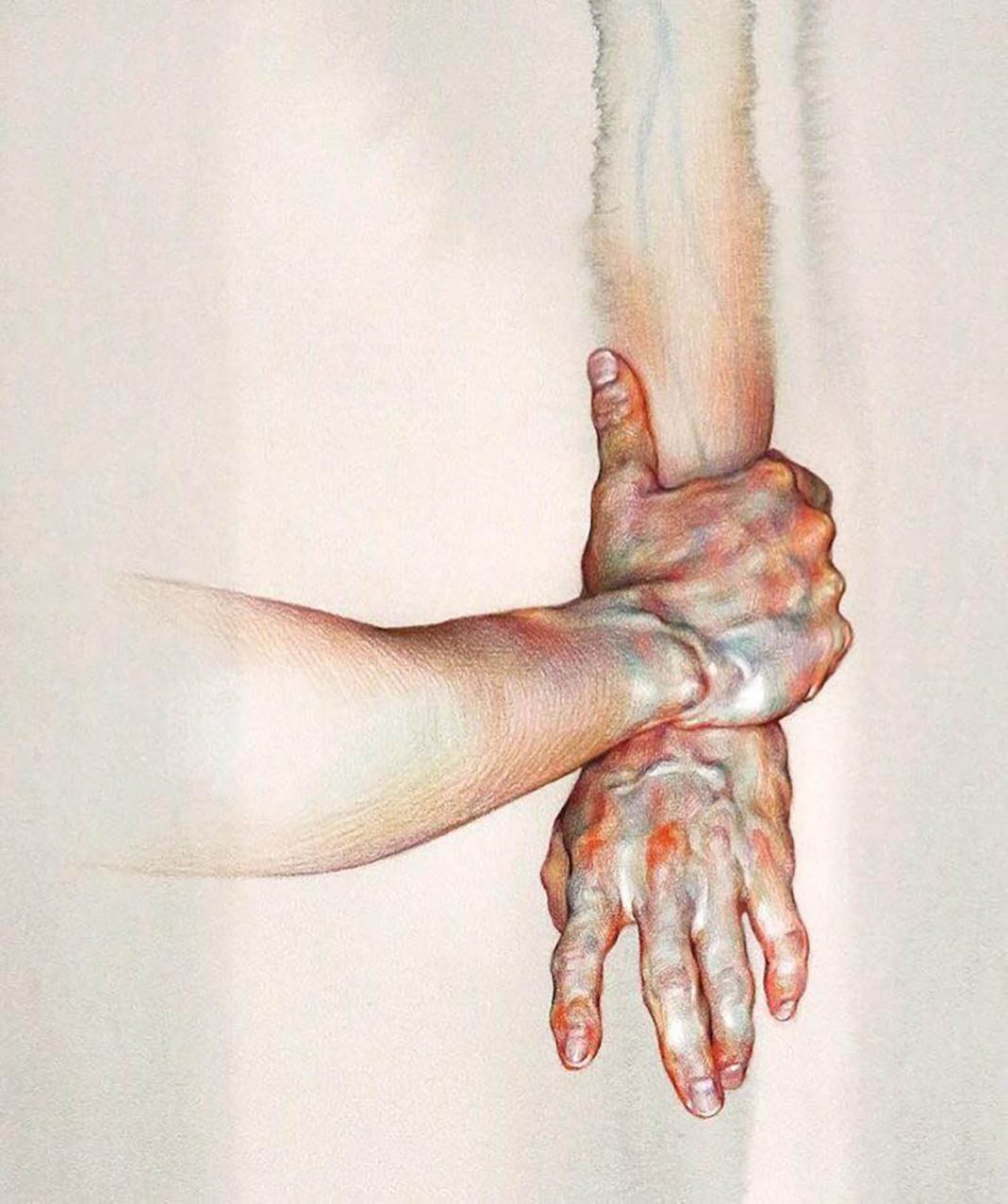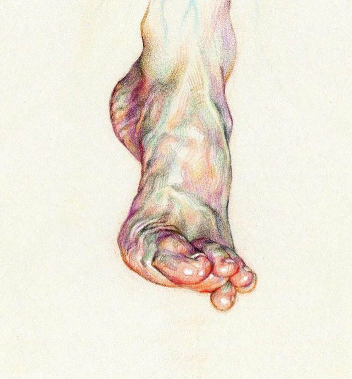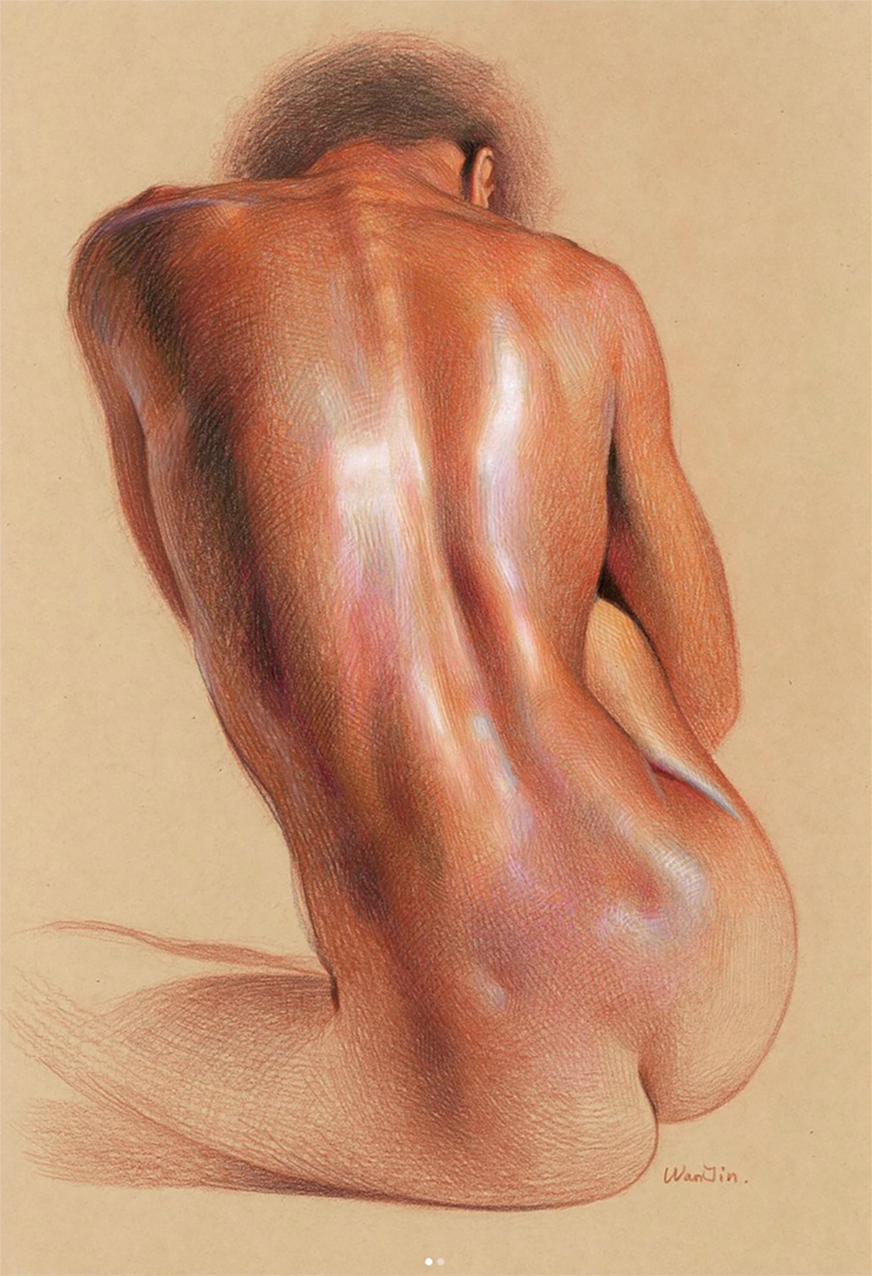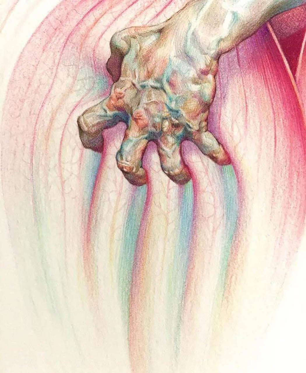 Fascinated by the paintings of Lucian Freud, Wanjin incredible creates sensual hyperrealistic paintings and drawings of the human anatomy, particularly hands and feet. He usually paints nudes that allow him to express the abstract curves of the human body and the infinite tones of the surface of the skin so you can almost feel its texture. His artworks carry a delicate realism full of details in which you can even distinguish veins, hairs and muscles. Working with coloured pencils acrylic paint and inks he creates complex hatched layers of colour, and adding paint or ink to soften the image giving it an ethereal look.